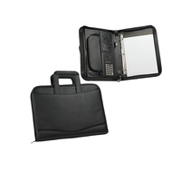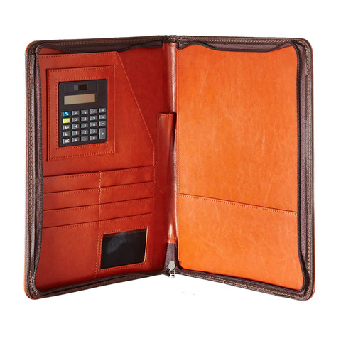 Fermuarlı iş portföyü Padfolio hesap makinesi ile 3 klasörler A4 not defteri profesyonel siyah PU deri dosya